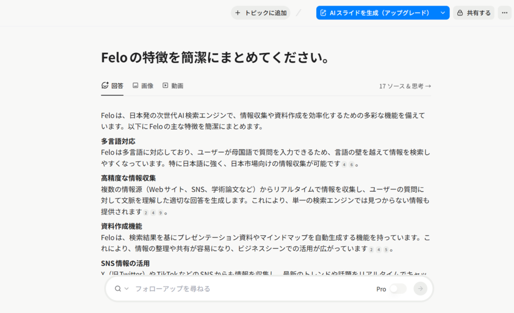 特に、Feloの「プロフェッショナル検索機能(Pro検索)」を使えば、複数のウェブサイトやニュース記事を横断的にリサーチし、深い思考プロセスを経た出力を得ることが可能です。膨大なテキスト情報が1枚のビジュアル資料にまとまることで、「なんとなくわかった気がする」から「構造として理解できた」状態にしっかりと引き上げてくれます。