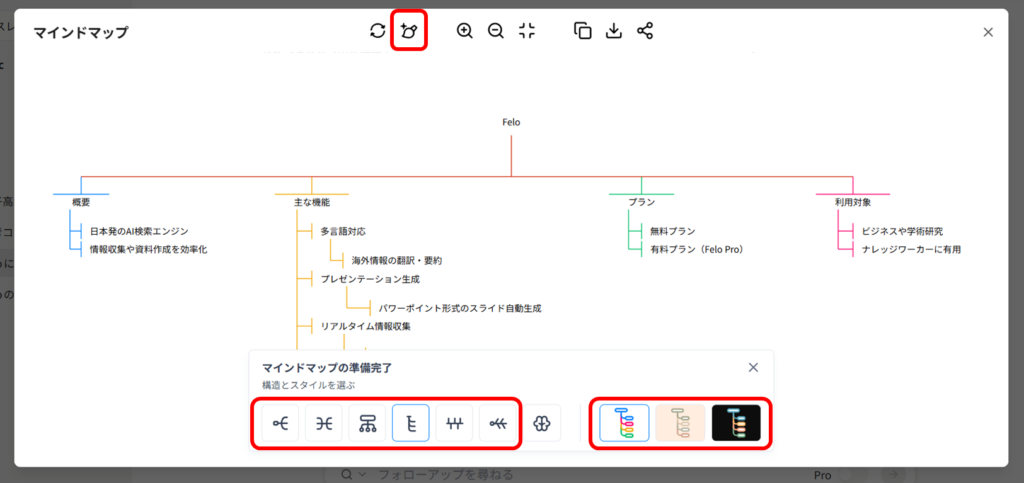 マインドマップ生成後、画面上部の「構造とスタイルを選ぶ」アイコンをクリックすれば、提示された候補の中から構造やスタイルを自由に変更できます。