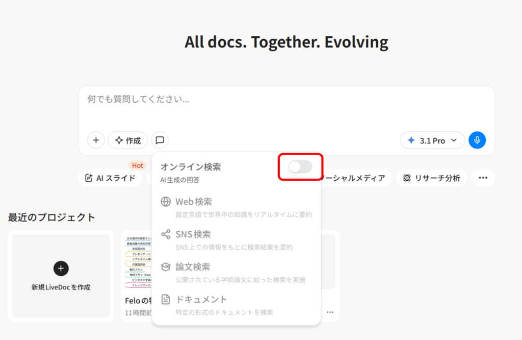 先ほど少し触れましたが、FeloではWeb検索機能(Web検索モード)の「ON/OFF」を自由に切り替えられます。