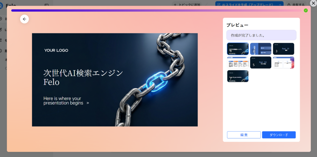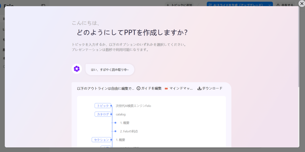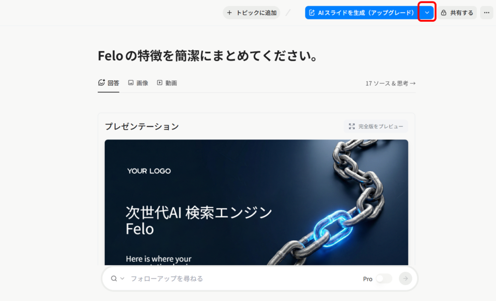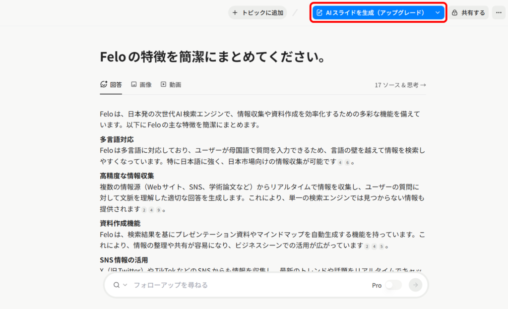 確かにFeloではPro検索をオフにした、通常のAI検索は無制限で行えますが、AIスライドの生成には別途クレジットを消費します。