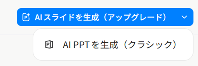 過去のUIでは「文書を表示」という名前だったこのメニューが、最新UIでは「AI PPT を表示(クラシック)」に変更されています。名前が変わっているので、過去の解説記事を見ながら操作しているとさらに迷いやすいですね。
