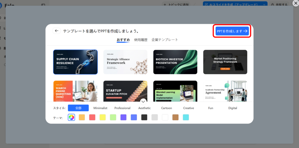 アウトラインやテンプレートを確認し、必要に応じて編集して、スライド原稿の生成をスタートします。