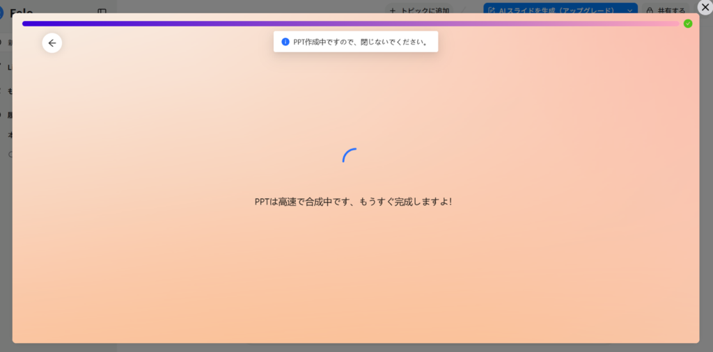 ただし、スライド生成が途中の段階でリロードするのは絶対にNGです。処理ステータスがリセットされて、連携ボタンが出なくなるどころか、スライドのデータ自体が不完全な状態になってしまいます。「まだかな…」と待ちきれずにF5キーを押したくなる気持ちは分かりますが、ここはグッとこらえて完了を見届けてから更新しましょう。