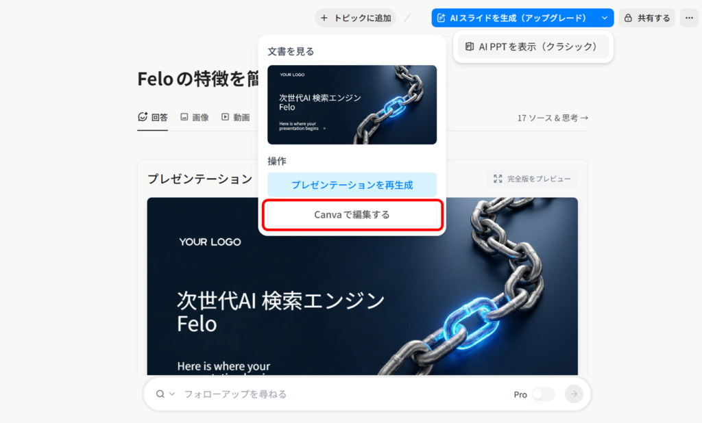 「連携ボタンが見当たらない」と感じている方の多くは、LiveDoc上で作業していることが原因であるケースが多いです。Canvaとのワンクリック連携を使いたい場合は、Feloのトップページ(チャット検索窓がある画面)からプロンプトを入力してスライドを生成する必要があります。