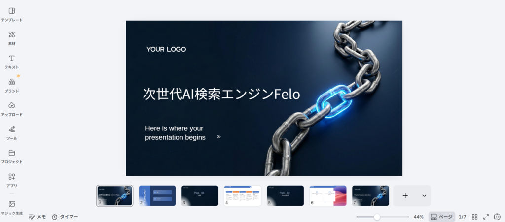 この操作が完了すると、Canvaの編集画面にFeloで生成したスライドがそのまま展開されます。あとはCanva上で自由にデザインを整えるだけです。