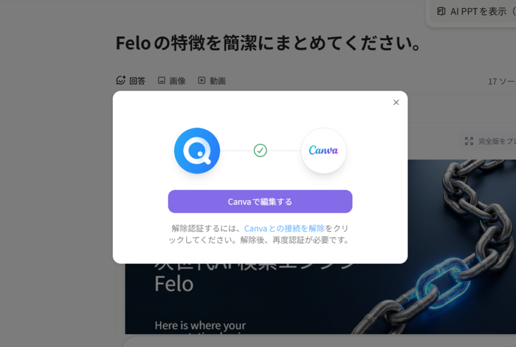 サインアウト後はFeloに再ログインし、作成済みスライドを開き直して「Canvaで編集する」ボタンから、認証・アクセス許可を再実行します。