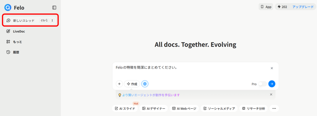 まずはFelo 公式サイトからログインし、LiveDocではなくトップページのチャット検索窓にプロンプトを入力します。